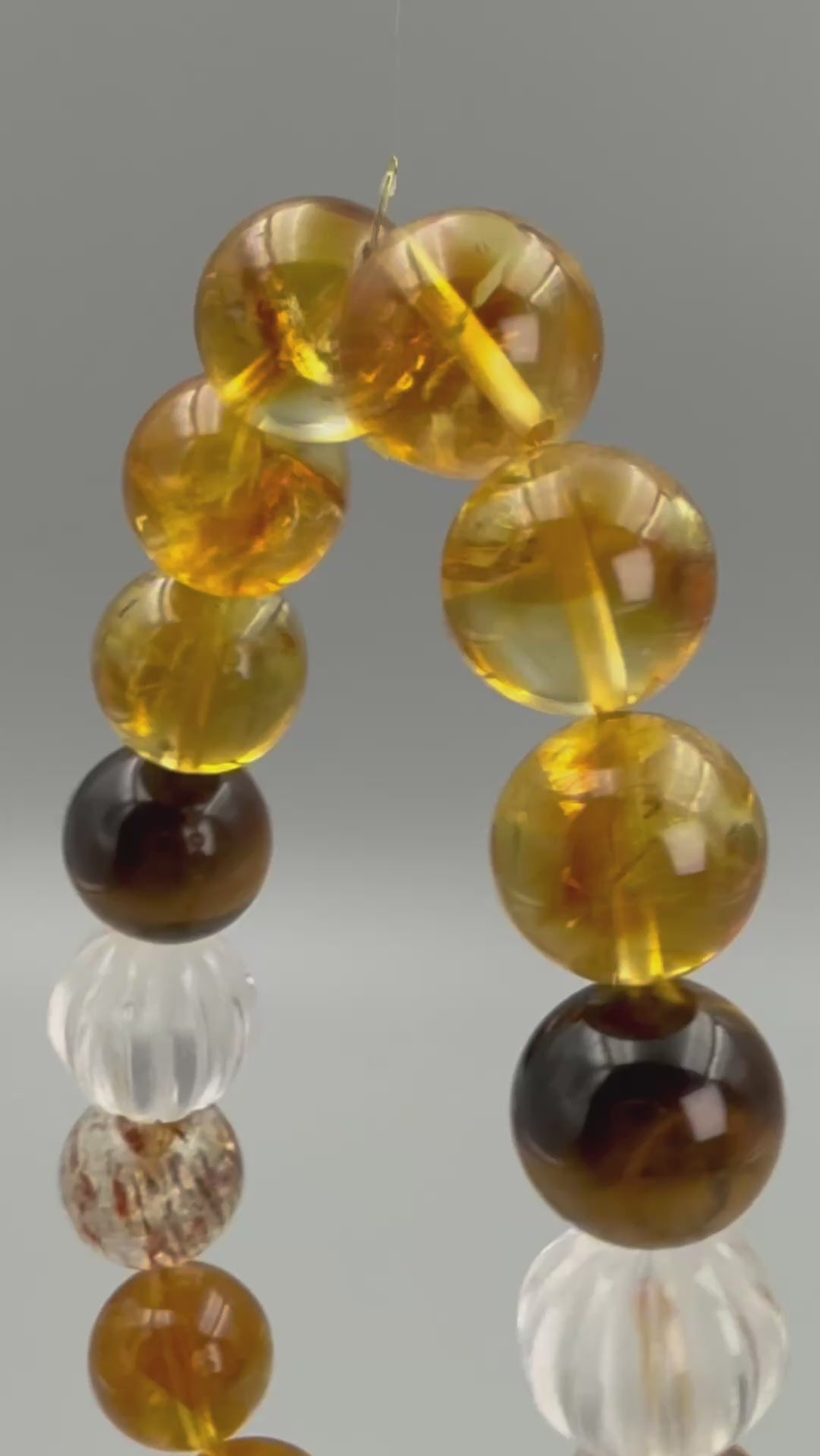 - Textured Details – Rutilated Quartz with fine golden threads and carved Clear Quartz “pumpkin” beads for added dimension